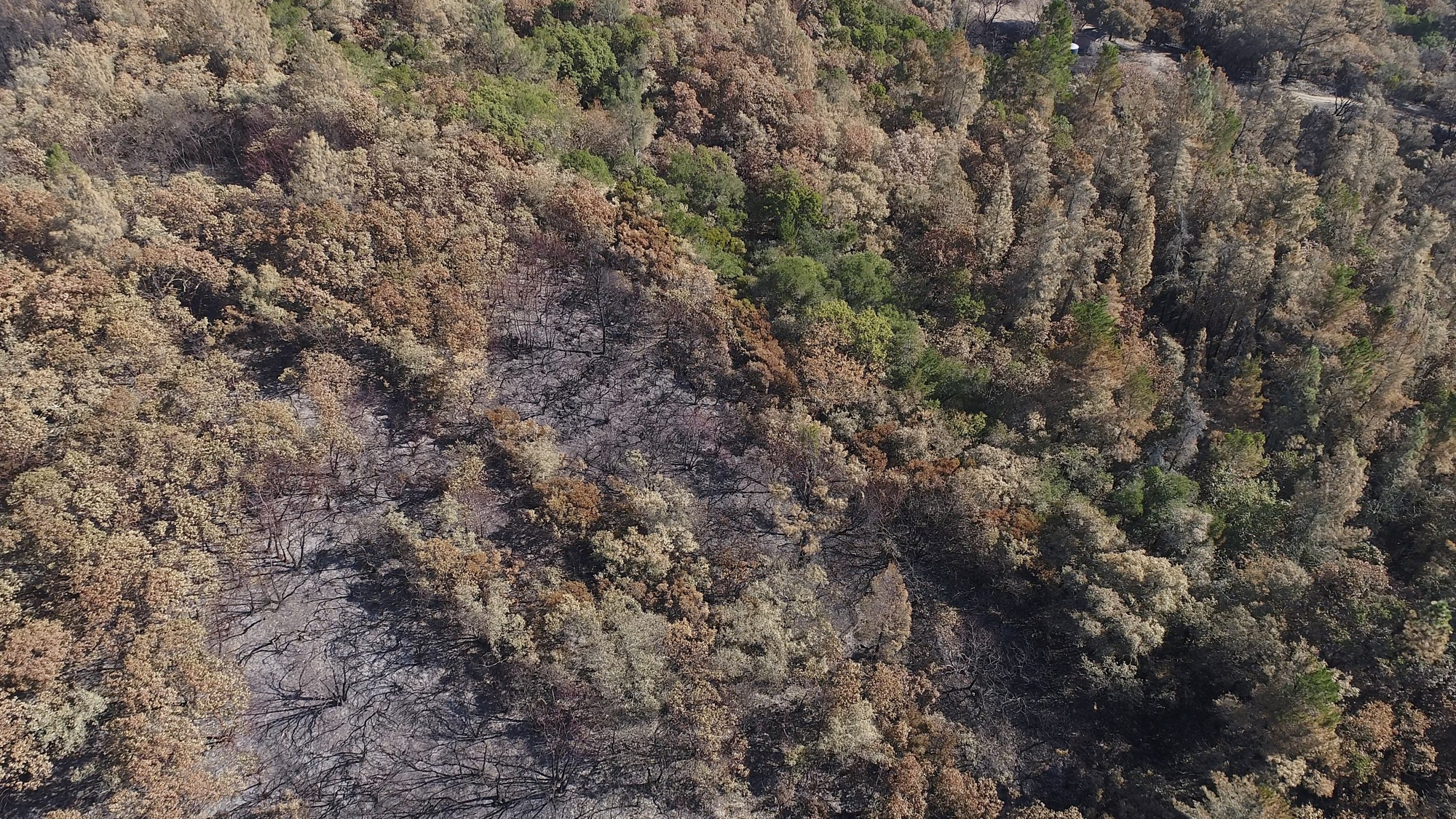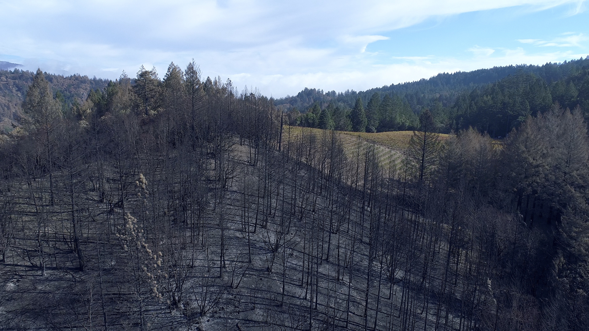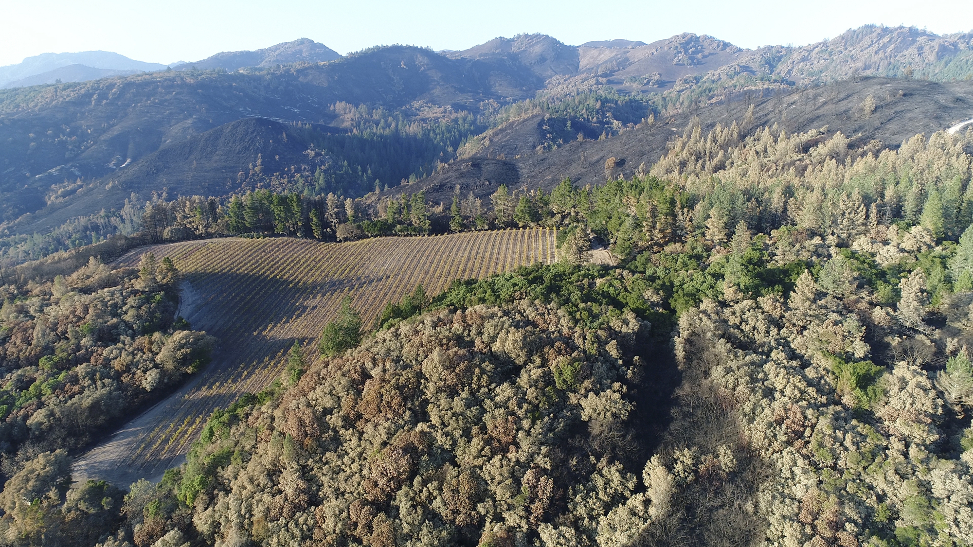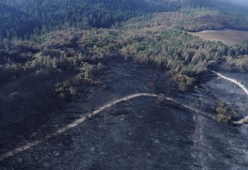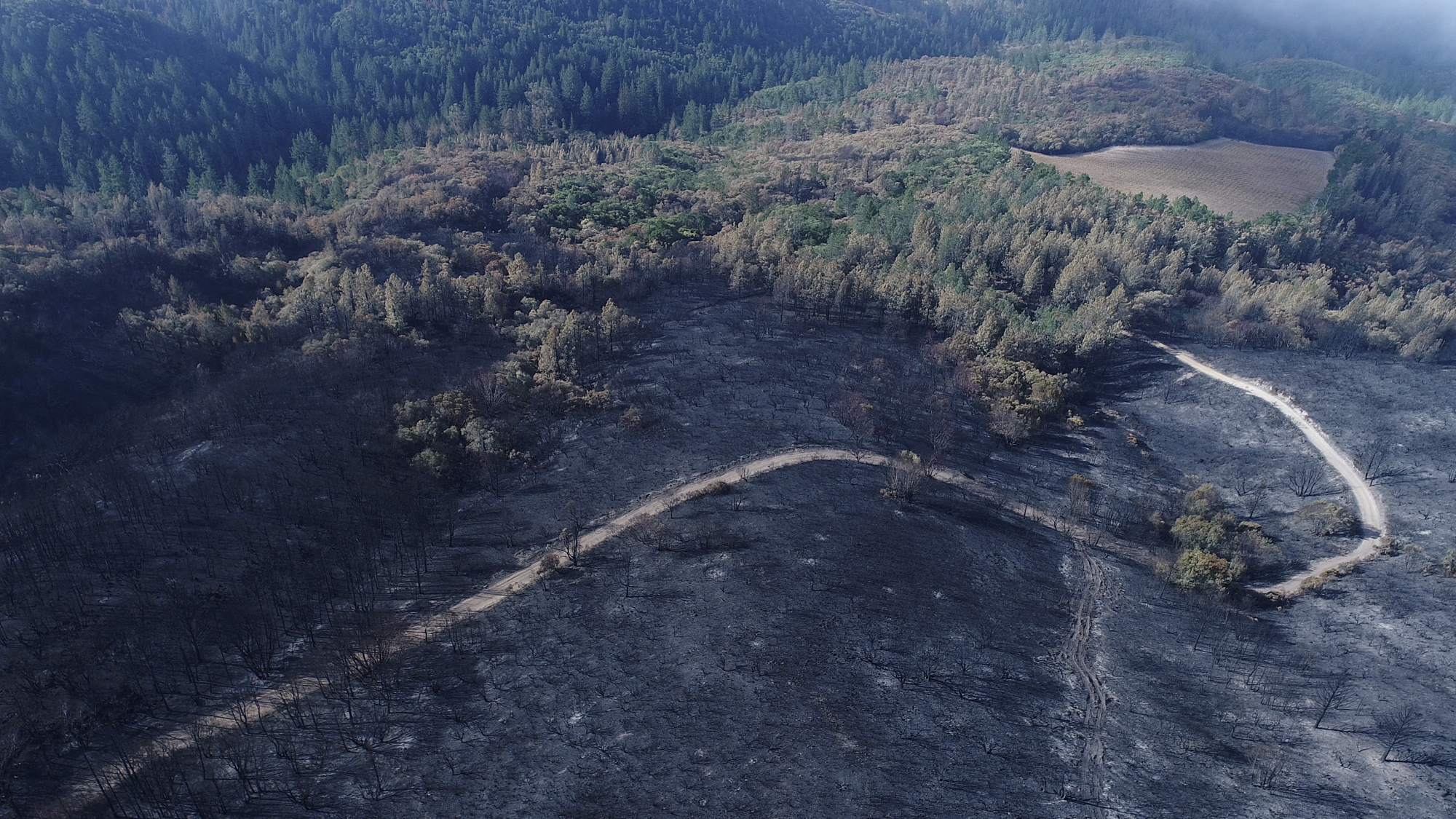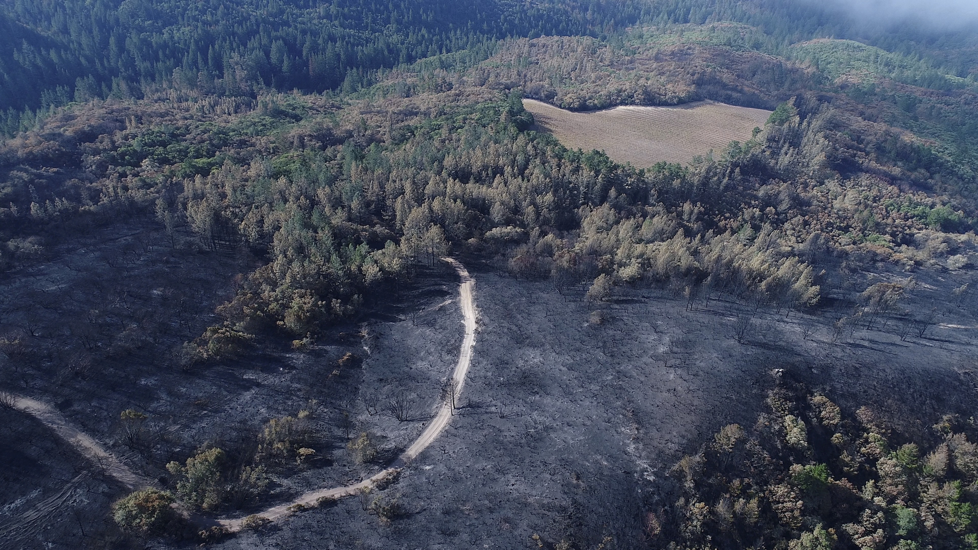 Originally hired in March of 2017 by a Napa engineering company charged with developing this 280 acre Mayacamas Mountain property into a vineyard, I mapped the property into a 3D model and provided high-resolution ortho-mosaics using some 2300 aerial images captured over a 2 day period. The land was rugged, with elevation differentials of more than 1000' from top to bottom, and much of it impossible to access, but after several careful days of planning and inspection and 16 flights from varying elevations, the job was complete. Unfortunately, 6 months later, 80% of this beautiful property was consumed in the devastating Nunn's Canyon wildfire of 2017. I returned on October 28th, less than 2 weeks after the fire and began to "fly" the property again, this time under considerably harsher conditions. Spot fires were still burning and the ash on the ground and in the trees so heavy that I was forced to wear a respirator and protective clothing as I captured the images below.