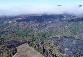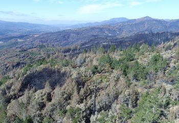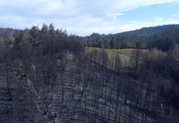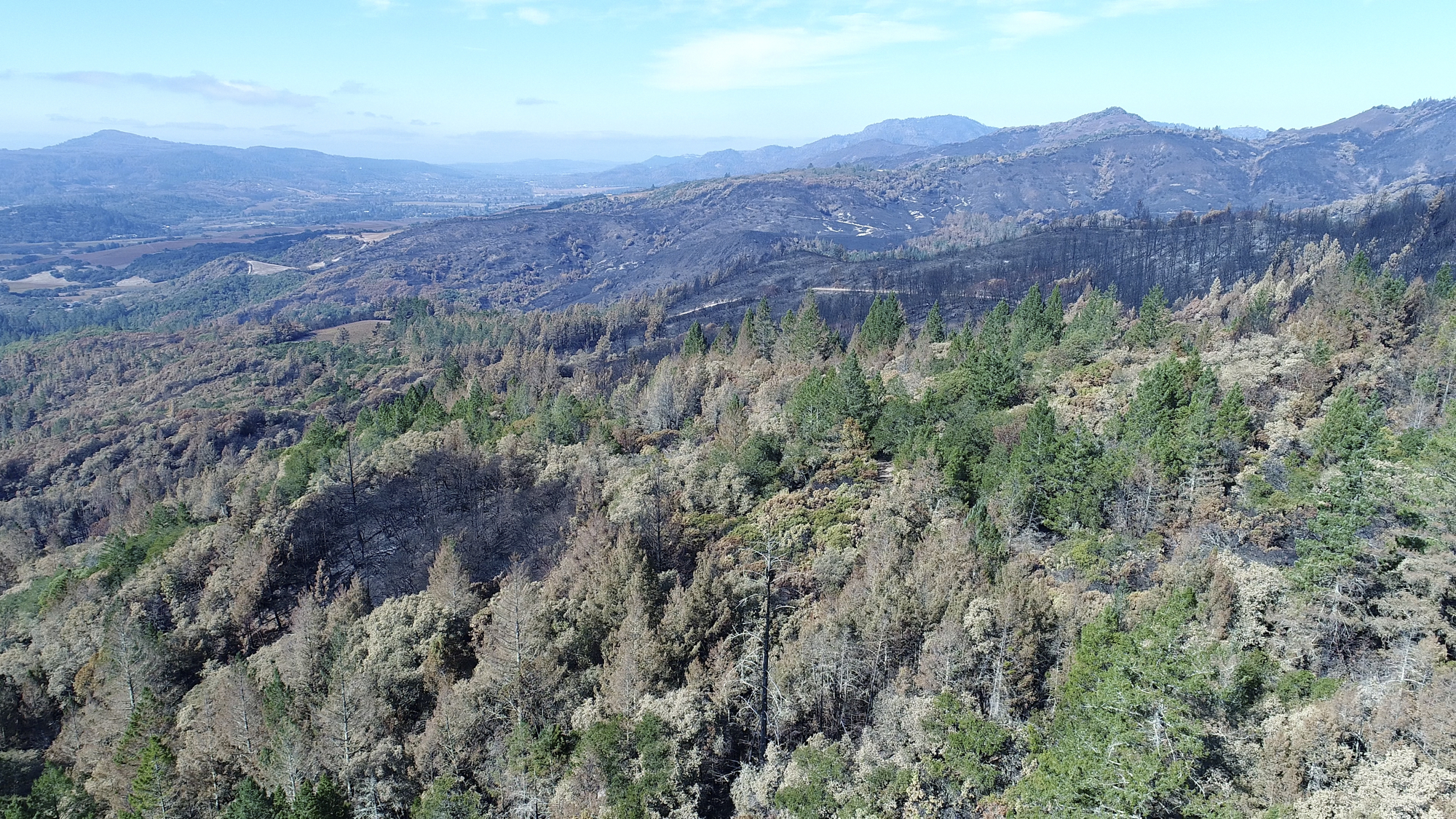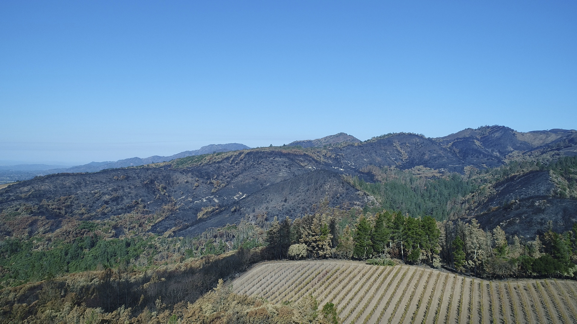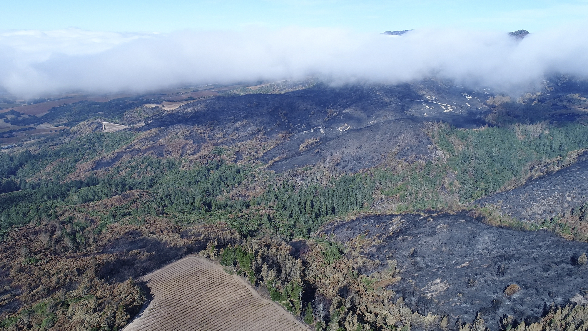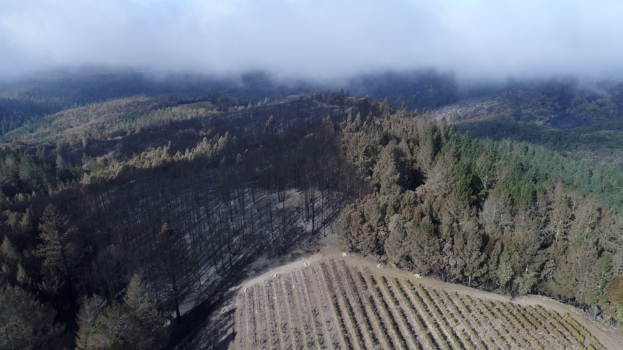 Originally hired in March of 2017 by a Napa engineering company charged with developing this 280 acre Mayacamas Mountain property into a vineyard, I mapped the property into a 3D model and provided high-resolution ortho-mosaics using some 2300 aerial images captured over a 2 day period. The land was rugged, with elevation differentials of more than 1000' from top to bottom, and much of it impossible to access, but after several careful days of planning and inspection and 16 flights from varying elevations, the job was complete. Unfortunately, 6 months later, 80% of this beautiful property was consumed in the devastating Nunn's Canyon wildfire of 2017. I returned on October 28th, less than 2 weeks after the fire and began to "fly" the property again, this time under considerably harsher conditions. Spot fires were still burning and the ash on the ground and in the trees so heavy that I was forced to wear a respirator and protective clothing as I captured the images below.